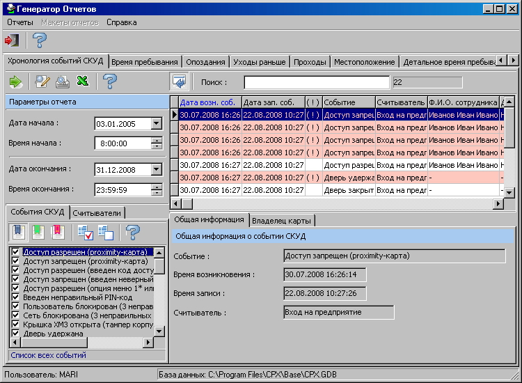 Комплекс «CPX» представляет собой набор программ, которые позволяют фиксировать все проходы сотрудников в базе данных, выполнять отчёты (об опоздании, об уходах раньше, о месте нахождения сотрудников и т.д.), создать для каждого сотрудника индивидуальный электронный пропуск.