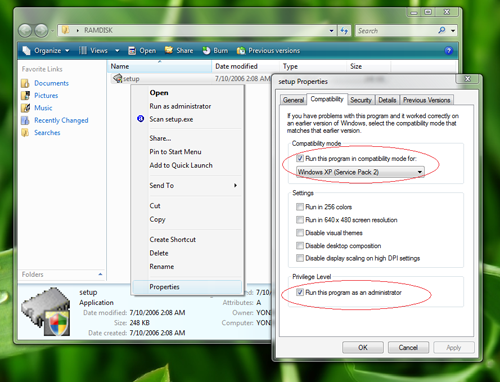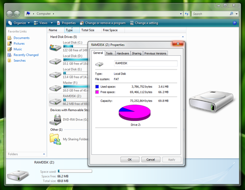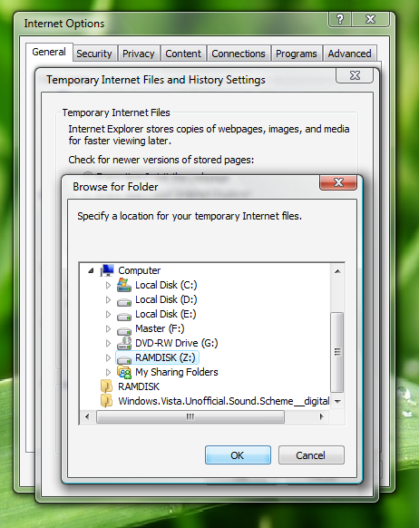 Сразу же обращаем ваше внимание, что данный твик окажется полезным владельцам компьютеров с оперативной памятью не менее 1Гб. Пользователям с меньшим объемом памяти пока не следует использовать твик или пробовать его в работе только после увеличения виртуальной памяти. Для использования нашего твика нам понадобится маленькое приложение под названием 'RAMDISK'. Для чего оно нужно? Приложение создает виртуальный диск из имеющейся системной памяти. Не волнуйтесь, наш виртуальный диск будет не более 60-80Мб. Начнем с того, что внесем несколько изменений в настройки IE. Вот что нужно сделать: 1. Открываем Internet Explorer, идем в меню Tools/Инструменты, далее Internet Options/Свойства обозревателя. 2. На закладке Privacy/Конфиденциальность ищем пункт Settings/Настройки и щелкаем по кнопке Advanced/Дополнительно. 3. Отмечаем пункт Override automatic cookie handling/Перекрыть автоматическую обработку cookie, а затем выбираем: First-party Cookies (Accept)/Основные cookie (Принять), Third-party cookies (Block)/Сторонние cookie (Заблокировать). ![]() Щелкаем OK и закрываем диалог Advanced Privacy Settings. Возвращаемся к окну Internet Options/Свойства обозревателя, выбираем закладку Advanced/Дополнительно. Прокручиваем список настроек донизу и отмечаем опцию Disable Phishing Filter/Отключить фишинг-фильтр. ![]() После завершения вышеописанных действий щелкаем Apply/Применить, затем OK и закрываем диалог Internet Options/Свойства обозревателя. Пришло время загрузить и настроить приложение RAMDISK. Единственное – нам придется помочь приложению работать под Windows Vista. На самом деле, ничего сложного тут нет, но вот, что нужно сделать: 1. Извлекаем приложение в любую папку, открываем ее, щелкаем правой кнопкой мыши непосредственно на файле Setup.exe. 2. Переходим на закладку Compatibility/Совместимость и делаем следующее: выбираем совместимость с Windows XP Service Pack2, ставим галочку рядом с пунктом Run this program as an administrator/Запускать от имени Администратора. 3. Щелкаем Apply/Применить и закрываем диалог. ![]() После настройки совместимости пришло время установить приложение. Устанавливаем. В ходе установке может возникнуть диалог UAC, так что подтверждаем и продолжаем установку. ![]() ![]() ![]() Если компьютер попросит вас перезагрузиться, позвольте ему это сделать. После загрузки компьютера в Control Panel/Панели управления появится новый апплет RAMDISK. ![]() Приступим к настройке. Зачем вообще нужен виртуальный диск? Ответ на этот вопрос вы получите чуть позднее. На закладке General/Общие выбираем букву для диска, которую вы хотите ассоциировать с будущим виртуальным диском, отмечаем пункт Automatic Startup/Подключаться при загрузке ОС и Emulate a local Hard Disk/Эмулировать жесткий диск. Теперь перейдем на закладку Geometry/Размеры и устанавливаем размер диска на 65Мб (опция Disk Size). Обратите внимание, что важно соблюдать предложенный нами размер и не превышать размера в 80Мб, потому, как было объяснено выше, виртуальный диск использует ресурсы оперативной памяти и дальнейшее увеличение объема виртуального диска может оказать негативное влияние на общую производительность системы. После установки новых значений необходимо перезагрузить компьютер. ![]() ![]() После перезагрузки, если все прошло нормально, в списке устройств должен появиться и наш виртуальный диск. Отрываем Computer и ищем новый диск – в нашем случае это диск Z:. ![]() Мы почти закончили, но чтобы наш твик заработал нам необходимо переместить временные папки Internet Explorer на только что созданный 