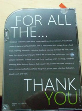 Главный инженер по развитию программного обеспечения Лэрри Остерман (Larry Osterman) рассказывает о своем подарке в блоге и даже прилагает несколько фотографий. Лицевая поверхность его коробки Windows Vista выполнена в духе упаковки Windows Vista Ultimate, а на обороте написано: «ЗА ВСЕ... Восхищенные клиенты, великие идеи, крайне сжатые сроки, продуманные решения, линии кода, страницы спецификаций, запуск автоматизации, строки текста, экраны UI, пропущенные ошибки, нахождение ошибок, работа в команде, бесчисленные итерации, готовность нарушать правила, долгие часы, проведенные вдали от близких, подъемы ранним утром и конец работы поздней ночью, отсроченный отпуск, упушенные возможности, долгие встречи, короткие встречи, отмененные встречи, не использованные разработки, разработки, которые продолжат жизнь, крах машины, моменты победы, моменты поражений, кофе, пончики, пиццы, пиво, неустанные пот, кровь и слезы. СПАСИБО» ![]() Главная особенность такого мероприятия, по словам Лэрри, в том, что за все 22 года его работы в Microsoft, то, что раньше было частным делом, на сей раз стало общественным событием. Возможно, причиной этому является то, что теперь, когда разработка Windows Vista уже позади, люди хотят еще раз все вместе испытать радость (и облегчение) этого момента и получить вознаграждение за их вклад в историю программного обеспечения.