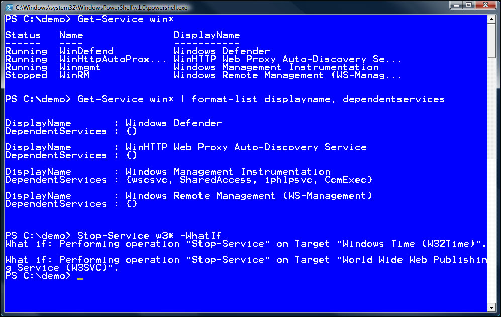 Следующая команда сообщит вам, какие сервисы, начинающиеся с "w3", должны быть остановлены. Эта утилита позволит вам исследовать особенности PowerShell без причинения какого-либо вреда вашей системе.