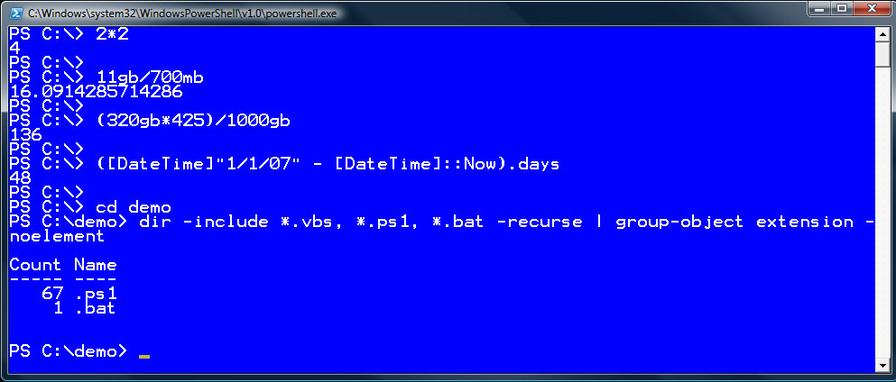 В Windows Vista есть множество различных типов файлов: для логов событий, групповых политик и прочего. PS1 это расширение файлов скриптов Windows PowerShell. Вот команда, которая вернет количество VBScript-файлов, bat-файлов и скриптов PowerShell в папке и ее подкаталогах.