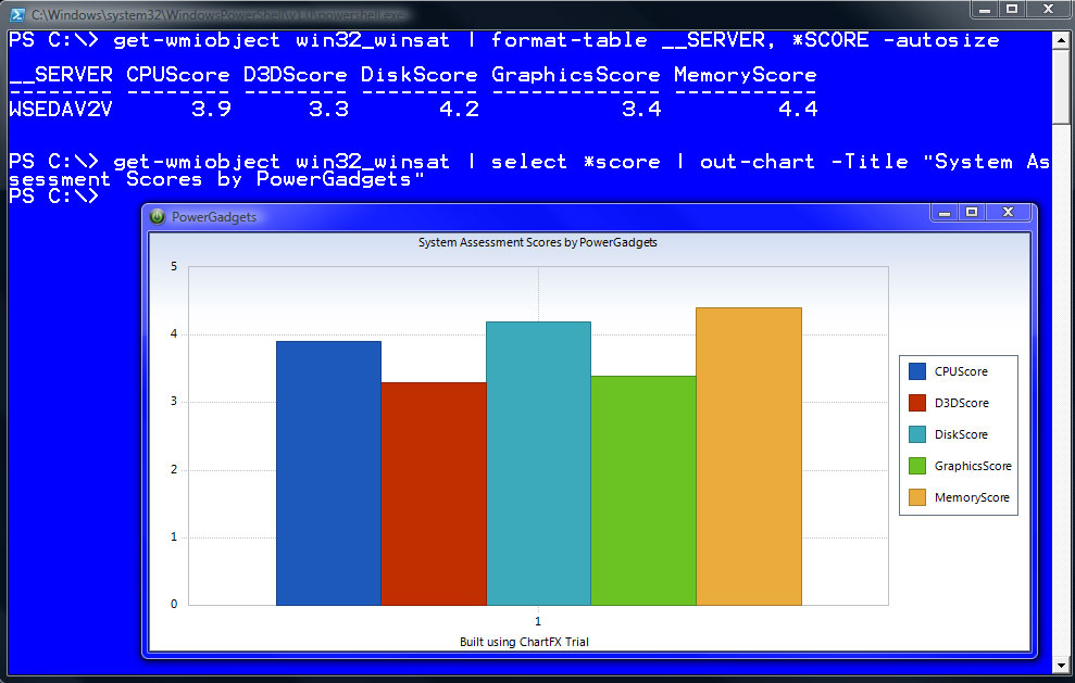 PS> get-wmiobject win32_winsat | select *score | out-chart -Title "System Assessment Scores by PowerGadgets"