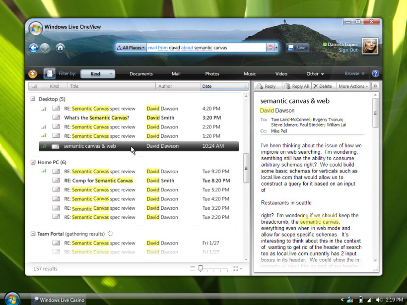 В конце нашего небольшого "путешествия" вы увидите скриншот Windows Search 4, отображающий предварительный вариант "Casino/Windows Live OneView". Будет ли это каким-то прорывом в UI или же название "Casino" для Windows Search 4 значит то же, что и "Longhorn" для Windows Vista? Время покажет. А пока давайте остановимся на основных моментах. Изначально «Casino» был задуман как поисковый рабочий стол нового поколения, который объединяет в себе поиск локальных и удаленных данных с получением максимального результата, экономя, таким образом, время и уменьшая количество усилий, которое требуется для поиска, и, при этом, вы видите именно то, что искали. Windows Search 4 был разрекламирован как часть приложения Windows Live, а также были отмечены люди, вовлеченные в его создание. В настоящее время над Windows Search 4 работает команда Windows Desktop Search и члены исследовательской группы Microsoft, которые работали над опытным образцом поиска следующего поколения под кодовым названием «Tesla». Когда работы над Windows Vista и Office 2007 подходили к завершению, для Microsoft стало очевидно, что технологии этого приложения должны быть интегрированы в Windows Desktop Search, вместо того, чтобы выпускать их как отдельный продукт. Вот несколько причин этому: лучшая интеграция, улучшенная управляемость на предприятии, более легкий процесс распространения. Как много времени им потребуется, чтобы выпустить предварительную версию продукта, известного как «Casino»? После недавнего изречения представителя Microsoft, сказавшего «он будет готов тогда, когда будет готов», нельзя делать никаких предположений на этот счет. Лучше, просто подождать. ![]()