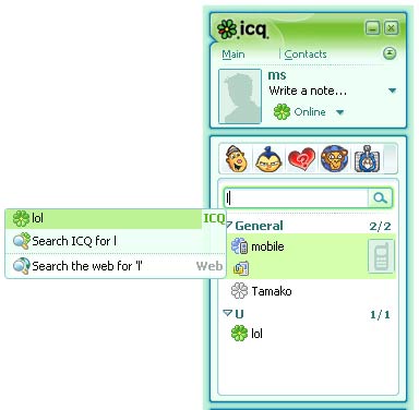 ![]() Число абонентов в списках контактов многих пользователей ICQ давно исчисляется не десятками и сотнями. Сортировка контактов по папкам – удобно, но в случае с большим списком - не очень удобно. В ICQ 6 проблема поиска нужного контакта решена очень оригинально – в верхней части окна программы есть окно для поиска. Как только вам потребуется найти абонента, то начинайте набирать его ник. По мере набора программа будет выводить подходящие ники во всплывающем окне. Как только увидите нужный, можно щелкать по нему и набирать сообщение.