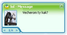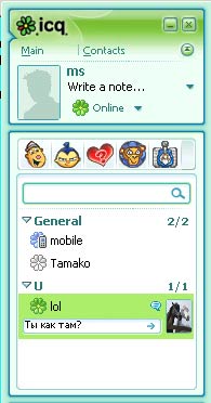 ![]() В таком окошке выводится ник отправившего сообщение, текст, а также общее число непрочитанных посланий и кнопки для перехода к следующему сообщению. Переключаться между посланиями, собранными в этом окошке, можно свободно, не боясь, что какое-нибудь из них пропадет, как только будет прочитано. Вы можете спокойно все их прочитать, затем вернуться к первому или ко второму и, кликнув по нему, начать общение. Кстати, небольшие всплывающие окошки в шестой версии ICQ можно увидеть не только, когда вы заходите прочитать сообщения, полученные в ваше отсутствие. В программе есть функция быстрой отправки сообщений прямо из списка контактов. В этом случае привычное окно не открывается, а полученные в ответ сообщения выводятся в том же маленьком окошке. Для отправки быстрого сообщения нужно подвести курсор к нику и нажать кнопку в виде значка цитаты. Поле для ввода текста появится тут же, в списке контактов. Для отправки сообщения нужно нажать на стрелку справа.