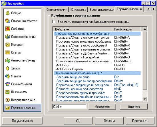 ![]() Одна из причин, по которой программа работает очень быстро – полное отсутствие какой бы то ни было онлайновой рекламы. Разработчики программы обещают, что и в последующих версиях QIP они не станут использовать надоедливые рекламные модули. Еще одно преимущество QIP перед другими клиентами – небольшой размер дистрибутива. А еще QIP не нужно устанавливать, достаточно скачать архив со всеми необходимыми для работы файлами и распаковать его. Благодаря этому программу удобно использовать на "чужих" компьютерах, например, в гостиницах, интернет-кафе, а также носить с собой на "флэшке". Кстати, о мобильности. Кроме версии для настольных компьютеров, существует QIP для смартфонов Nokia S60 на базе операционной системы Symbian, а также для КПК и смартфонов, работающих на платформе Windows Mobile 2003/5.0. Эти версии находятся на стадии тестирования, последнюю версию всегда можно найти на официальном форуме. В программе можно устанавливать четырнадцать различных состояний, от «Do not disturb» (Не беспокоить) и до «Launch» и «Depression». Все они дают понять, настроен ли пользователь на беседу и в каком он сейчас расположении духа. В отличие от "родного" ICQ-пейджера, в программе практически никогда нельзя столкнуться с проблемами кодировки, однако на тот случай, если собеседник получает сообщения в нечитаемом виде, можно воспользоваться автоматической транслитерацией набранного текста, для чего достаточно нажать CTRL+T. По-умолчанию для большинства команд назначены горячие клавиши. Чтобы они заработали, их нужно включить в настройках.