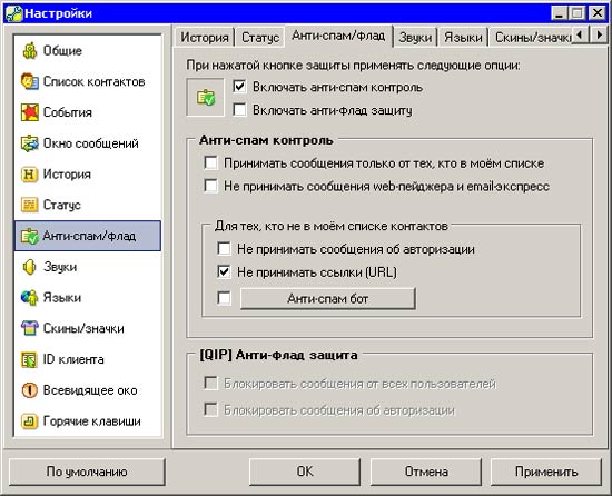 ![]() При желании, большинство клавиатурных сочетаний можно переназначить, хотя, по большому счету, в этом нет особого смысла – они достаточно продуманны. Даже если вы никогда не работаете с "горячими клавишами", одно сочетание все же постарайтесь запомнить - CTRL+F12. Оно включает функцию "Анти-босс", которая в мгновение ока скроет QIP с рабочего стола. Программы не будет видно нигде, даже в трее. Остается только надеяться, что ваш шеф не пользуется QIP и не знает, что повторное нажатие этих клавиш снова отобразит программу. Как и в настоящей жизни, в процессе интернет-общения вы можете сталкиваться c надоедливыми людьми, которые отнимают время пустыми разговорами или досаждают рекламой. В QIP есть несколько способов борьбы с ними. Во-первых, для этой цели в клиенте предусмотрен модуль против спама Anti-Spam Bot. С помощью этого модуля можно проверить, реальный ли человек отправил сообщение. Прежде чем пропустить сообщение от такого человека, ему может быть предложен простой вопрос, например «Напишите слово Армения». Если он не отвечает на этот вопрос, его сообщения автоматически блокируются. Также в QIP есть защита против флуда, ограничивающая размер переданного сообщения.