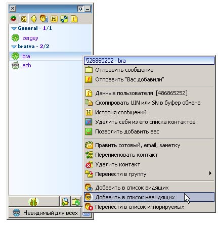 ![]() Кроме этого, в качестве еще одного метода решения проблемы с «нежелательными собеседниками», в списке контактов можно быстро указать, кто будет видеть, находится ли данный пользователь в онлайне, а кто – нет. Для этого нужно щелкнуть правой кнопкой по имени в контакт-листе и выбрать один из трех вариантов – видимый для пользователя, невидимый для пользователя и игнорировать все сообщения пользователя.