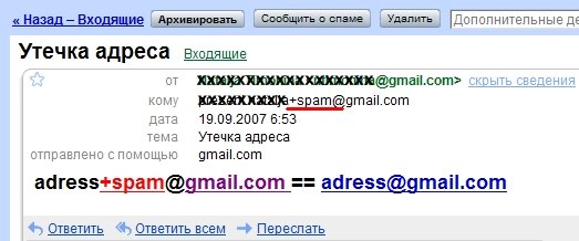 Никому такой вопрос не приходил в голову, откуда у отправителей спама появился адрес вашей почты ? Есть способ узнать. По крайней мере владельцам аккаунта в Gmail. Теперь можно делать эксперимент : И так далее. Все письма будут всё равно приходить на мой ящик , но зато посмотрев подробные сведения в письме со спамом я могу уже видеть, откуда им "пришёл" мой адрес. Теперь можно предупредить Васю Пупкина, что с его почтовой программы украли базу , например, или будут основания предьявить претензию к службе рассылки, которая клялась использовать адрес только для рассылки своих новостей и не публиковать мой адрес.