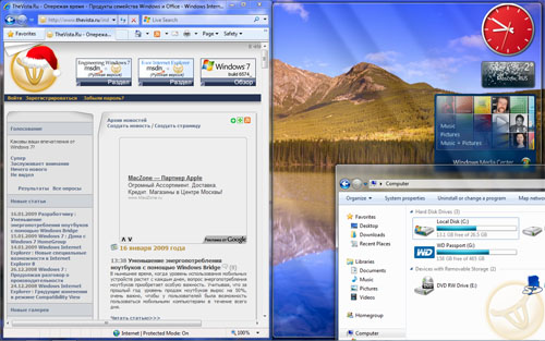 Особо стоит отметить функцию Aero Pick. Вот скажите, какого размера должны быть миниатюры открытых окон, чтобы вы могли безошибочно найти нужное окно? Правильно - нужно показать окно с его реальными размерами, содержимым и местоположением. Именно этой идеей руководствовались дизайнеры Microsoft при создании функции Aero Peek. Когда информации на панели задач недостаточно для точного определения окна, пользователь может подвести курсор к миниатюре на панели и вуаля — соответствующее окно отобразится на переднем плане, при этом другие окна отойдут на задний план и предстанут в виде стеклянных рамок. Когда необходимое окно будет обнаружено, просто щелкните на миниатюре. Это не только упрощает процедуру поиска окон, но и в некоторых сценариях вообще избавляет от необходимости переключаться между приложениями. Aero Peek работает и с рабочим столом: это можно сделать, наведя курсор мыши на кнопку Show Desktop, расположенную в правом конце панели задач. При нажатии на кнопку все окна сворачиваются, но если провести над кнопкой курсором, все открытые окна приобретут стеклянную структуру, позволив пользователю доступ к информации на рабочем столе. Таким нехитрым способом можно увидеть показания гаджеты погоды или убедится, что нужный файл находится на рабочем столе.
