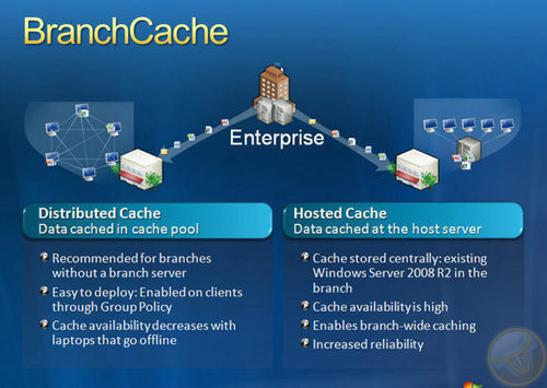 BranchCache может работать в двух режимах: в режиме Hosted Cache все кэшируемые файлы хранятся на сервере в филиале, работающим под управлением Windows Server 2008 R2; в режиме Distributed Cache наличие сервера в филиале вовсе не требуется, поскольку кэшируемые файлы хранятся на компьютерах пользователей сети филиала и при необходимости могут быть перенаправлены на другие компьютеры под управлением Windows 7. BranchCache обслуживает только тех пользователей, которые имеют необходимые разрешения, и распределяет лишь самые новейшие версии файлов.