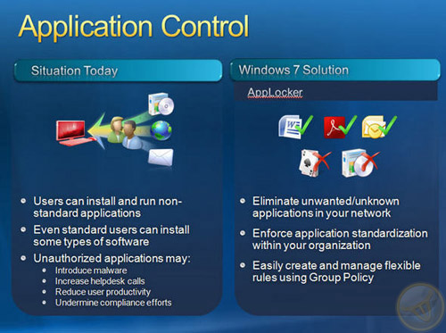. AppLocker - это то, чего многие ИТ-специалисты ждали очень давно и для чего были вынуждены использовать сторонние и довольно-таки дорогостоящие приложения. AppLocker является, по сути, развитием групповых политик Software Restriction Policies, которые дебютировали еще в Windows XP и предназначались для ограничения использования приложений. ИТ-администратор теперь вправе запретить запуск конкретного установленного на компьютере приложения по его атрибутам: пути, издателю и другим. Теперь сотрудникам компаний с рабочими станциями под управлением Windows 7 станет гораздо сложнее запустить любимое IM-приложение (или Косынку), если того пожелает руководство компании. AppLocker является очень мощным дополнением к групповым политикам и, безусловно, будет пользоваться популярностью в компаниях, желающих, чтобы их сотрудники не отвлекались от своей основной работы.