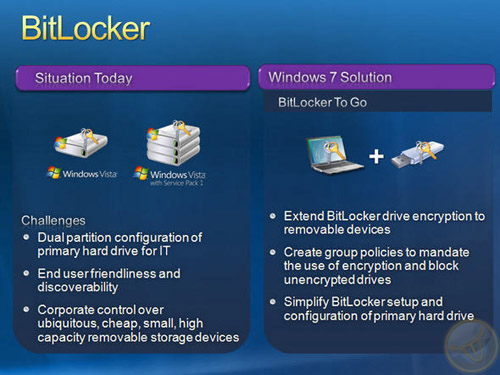 BitLocker полностью шифрует жесткий диск. И если раньше с помощью BitLocker можно было зашифровать лишь системный диск, то в Windows Vista SP1 была добавлена возможность шифровать логические диски. BitLocker To Go является следующим шагом в эволюции технологии и позволяет шифровать сменные накопители, в частности, USB-драйвы. С помощью BitLocker To Go можно зашифровать устройство и при необходимости прочитать его потребуется лишь ввести пароль, вставить смарт-карту или использовать оба способа авторизации одновременно. ИТ-администраторы вправе установить минимальную длину пароля и его сложность, а также с помощью групповых политик обязать пользователей включать BitLocker на съемных накопителях до того момента, как на них будет возможна запись. BitLocker To Go также позволит организовать более безопасный доступ к информации даже с теми пользователями, у кого установлена предыдущая версия Windows: для Windows Vista и Windows XP будут выпущены расширения, позволяющее осуществлять чтение [с помощью пароля] зашифрованного съемного накопителя.