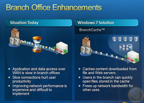 Первая из функций, призванных подчеркнуть выгоду от совместного использования Windows 7 и Windows Server 2008 R2. Функция BranchCache в Windows 7 призвана увеличить отзывчивость приложений в сети, чтобы у пользователей удаленных офисов (филиалов) складывалось впечатление, что они работают в головном офисе. При обращении к информации, хранящейся на сервере под управлением Windows Server 2008 R2, пользователям, находящимся в филиале, более не придется подолгу ждать загрузки из центрального офиса. Если функция BranchCache активна, копия информации, доступной с интранет-сайта или файл-сервера, локально кэшируется в филиале. Когда другой пользователь той же сети обращается к файлу, он получает доступ к этому файлу практически мгновенно, поскольку загружается он из локального кэша, а не по сети из головного офиса.