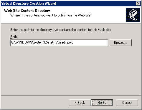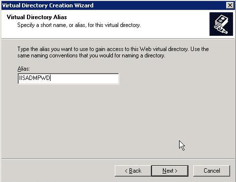 Находим Default Website и нажимаем правый кнопку на мышке. В появившемся меню, выбираем New --> Virtual Directory. У нас появится мастер. Нажимаем на Next и вводим имя IISADMPWD и далее Next...
