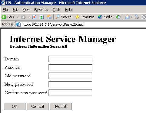 ![]() В следующем окне, указываем путь C:\Windows\System32\inetsrv\iisadmpwd и нажимаем на Next. ![]() Выставляем права Allow Read и Run scripts и нажимаем на Next, что бы закончить. ![]() Убедитесь, что у на Вашем сервере включена поддержка ASP. Открываем IE и идём по адресу http://servername/IISADMPWD/ae2xpb.asp ![]() Если уже и так Ваши пользователи не смогут сменить свой пароль, то Ваше дело ТРУБА :). Ну и на последок, небольшой Tip. Желательно, что бы на Default Website была запущена поддержка SSL ну и конечно-же, заход на страничку смены пароля был принудительно по SSL (HTTPs). Если система будет настроена без SSL, то вся информация будет передоваться не зашифрована, а именно plain text. После того как SSL установлен и настроен, из директории Inetpub\Adminscript надо запустить следующую команду: cscript.exe adsutil.vbs set w3svc/1/PasswordChangeFlags 0 Всё, теперь заходим на httpS://servername/IISADMPWD/ae2xpb.asp и меняем свой пароль, не переживая о том, что его могут перехватить.