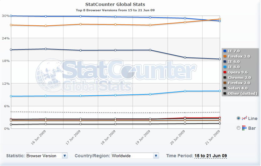 По версии сайта statcounter.com, браузер Firefox 3.0 впервые занял первое место популярности браузеров worldwide, то есть по всему миру. Очевидно, что популярность Firefox растет. Однако, ускорение выхода на первое место вызвано еще и массовой миграцией пользователей с бывшего лидера Internet explorer 7 на новую восьмую версию. Так, Internet Explorer 8 занял уже 10% рынка, что тоже неплохая новость и это можно назвать достижением. Схематичный рост доли IE8 и зависимость от этого доли IE7 можно посмотреть здесь. Стоит отметить, что общая доля бразуеров семейства Internet Explorer, все еще занимает первое место